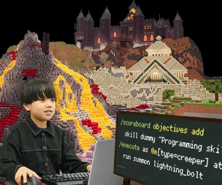 小学5年生から受講できる、お子さま向けのコースです。このコースでは、 /execute など、より高度なコマンドを日常的に活用し、ワンランク上のゲーム制作やシステム構築を目指します。