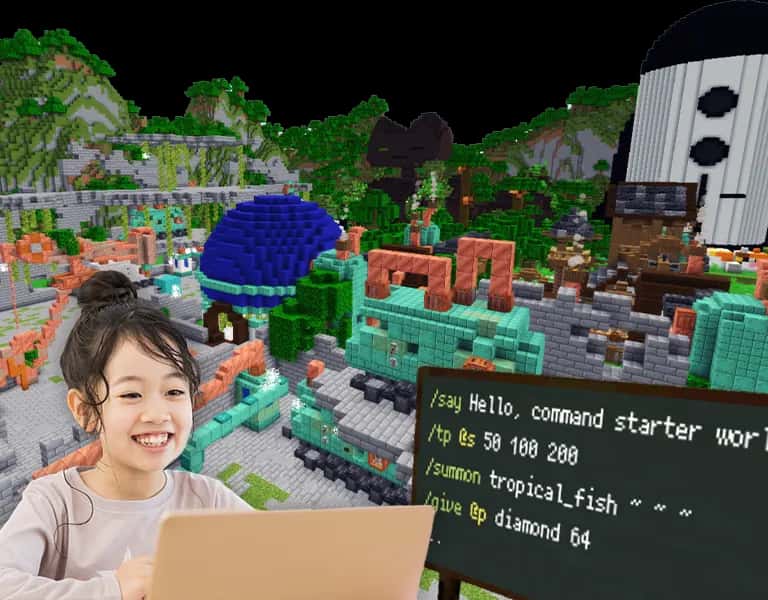 「コマンド スターター」は、小学1年生以上向けのコマンドプログラミング初級コース。/give や /summonなどのコマンドを使い、アイテムを出現させたり、キャラクターの動きを変える基本スキルを学びます。コマンドの基礎を楽しく習得し、マイクラの世界を広げよう!