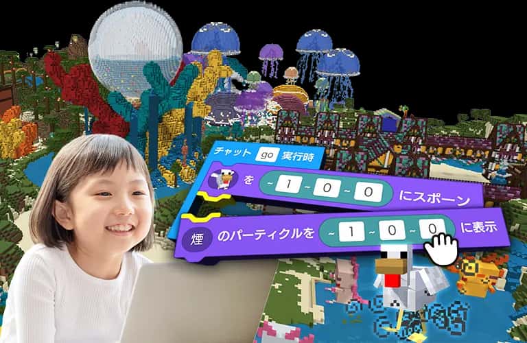 ブロックを組み合わせてプログラムを作り、マインクラフトの世界でキャラクターを動かしたり、モンスターを出現させたりすることができます。遊びの延長のような感覚で学べるので、楽しく続けられます!