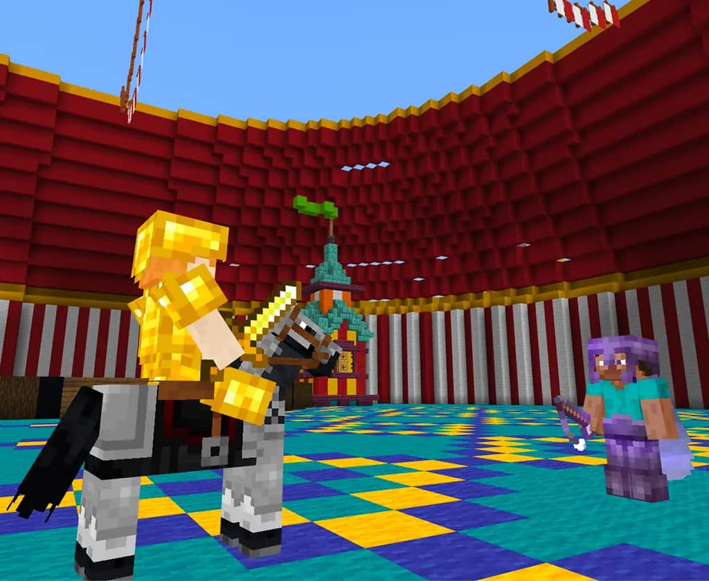 マイクラ遊園地での大冒険!パソコン操作から始めて、馬やラマのレース、右と左を練習するミニゲーム、そしてプログラミングの基礎も学べる!サーカス団の危機もキミの力で大成功させよう!